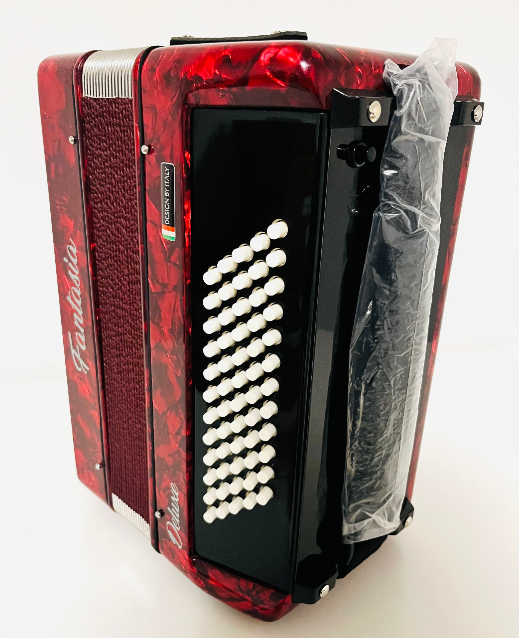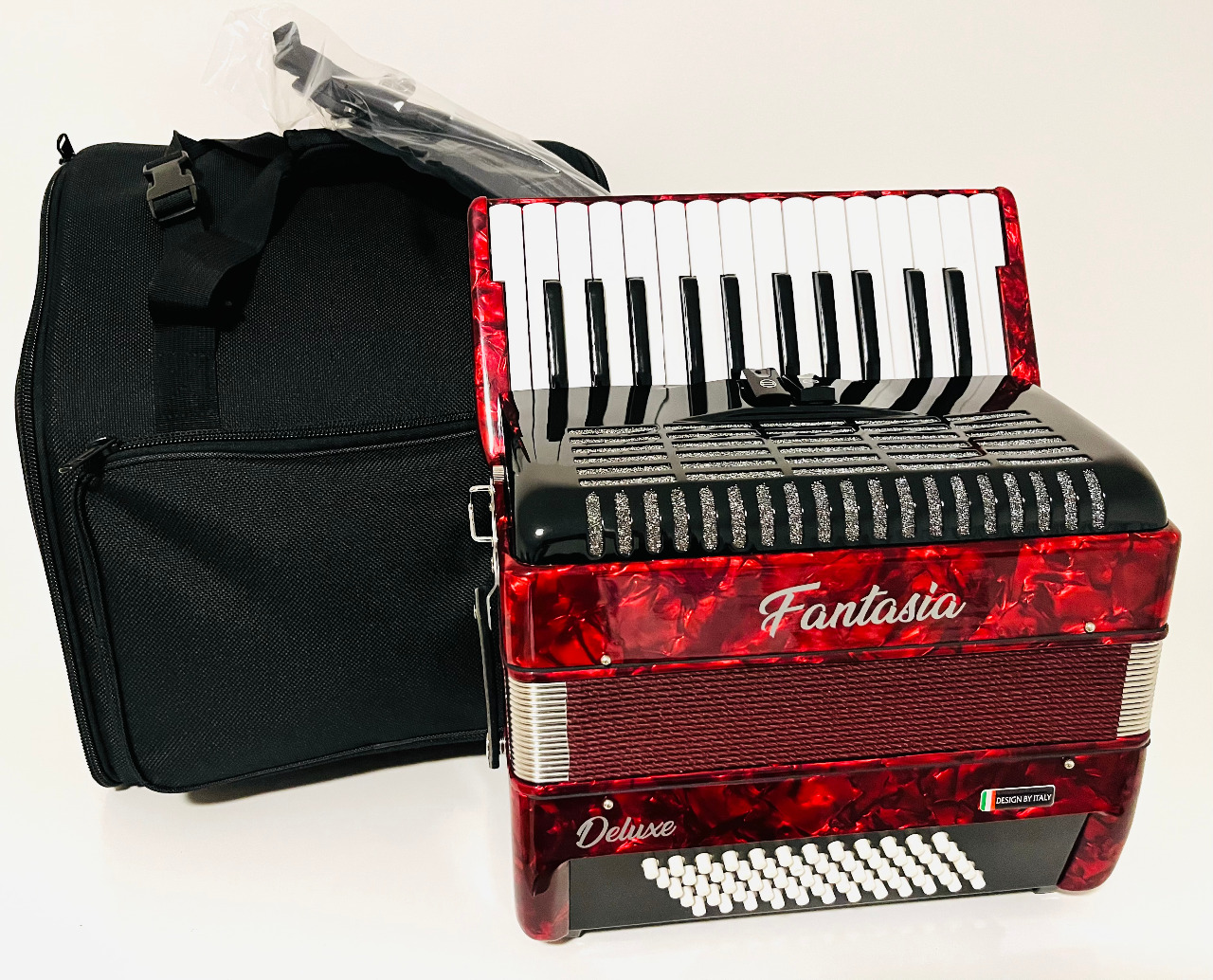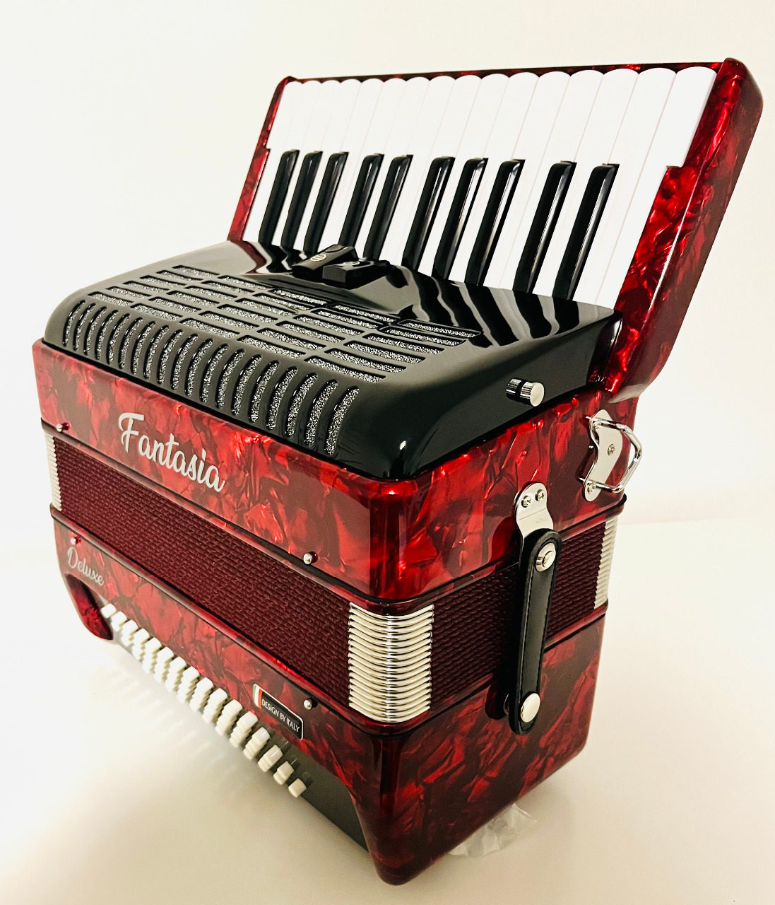 Nový akordeón FANTASIA- De Luxe 60 basový- nádherný zvuk, - ľahučky- váha iba 5,9 kg - 26 klávesový - rozsah od malé "h" po "c2" - nízky ponor kláves - rozmery výška 33 cm, šírka 17 cm - nádherné červené Mechy - Vhodný pre deti od 5 rokov, taktiež aj , dievčatá, mužov, ktorí hľadajú ľahký a zvučný akordeón. - záruka 24 mesiacov - v cene nové remene+ skracovaci chrbtový remeň - nový De Luxe vak - Možný osobný odber - možnosť zaslať v bezpečnom balení EXPRÉS KURIÉROM priamo k Vám domov- územie celej +15,-EURO- Euro. Info: 0944 737 758
